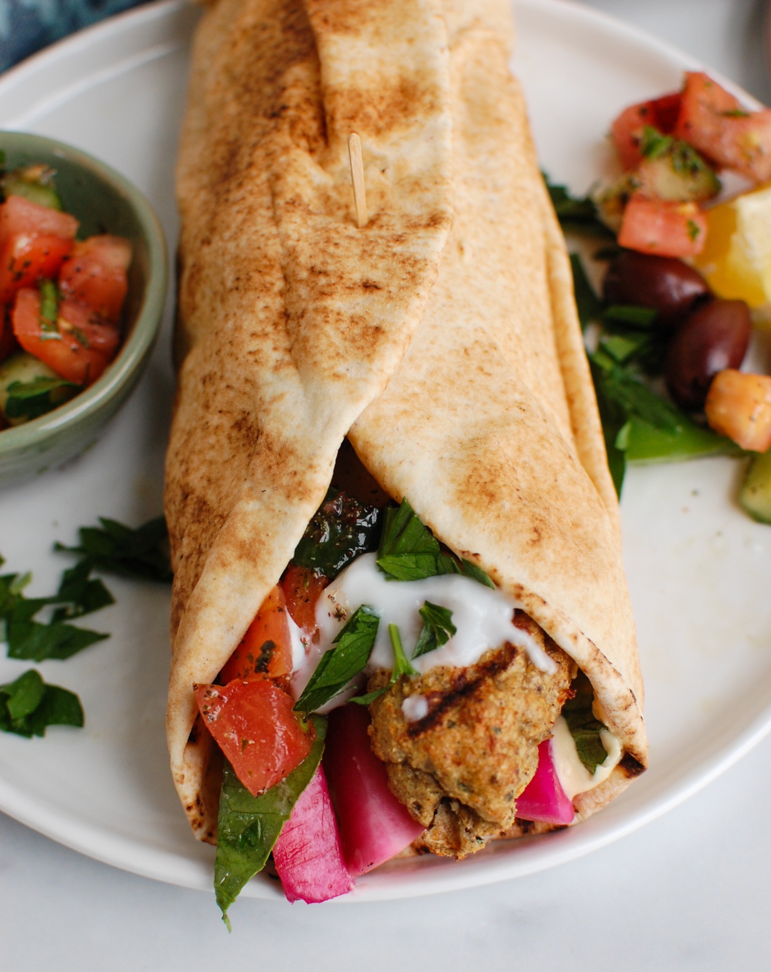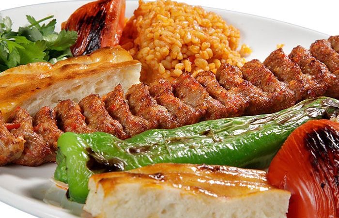 Mieszanka naszych dań z grilla: szaszłyk z kurczaka, wołowina BBQ, Adana kebab. Do tego sałatka, grillowana papryka i pomidor.