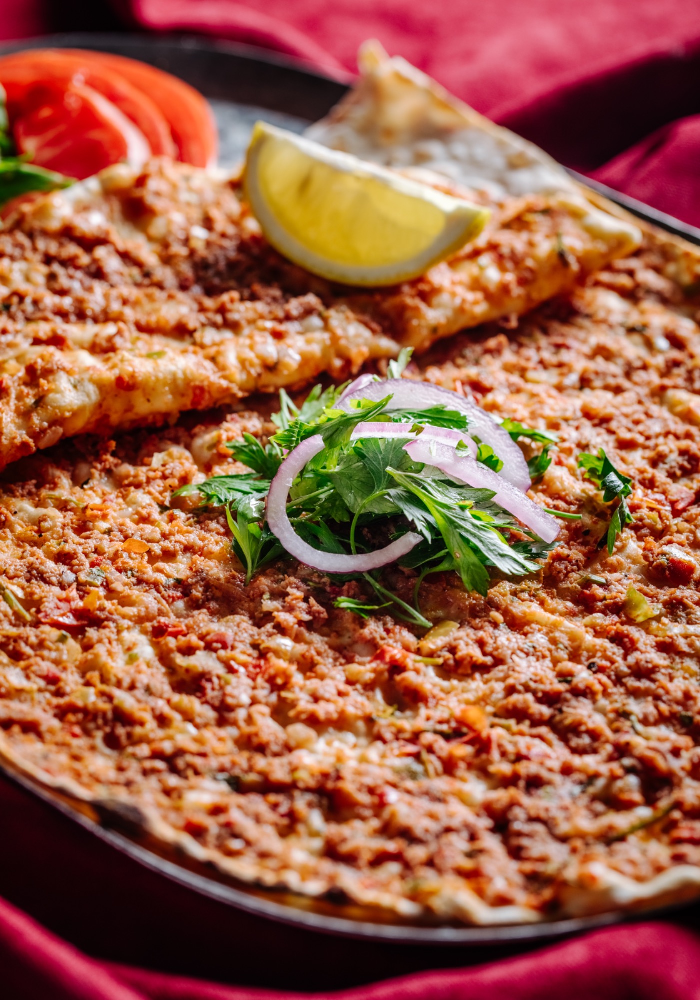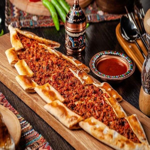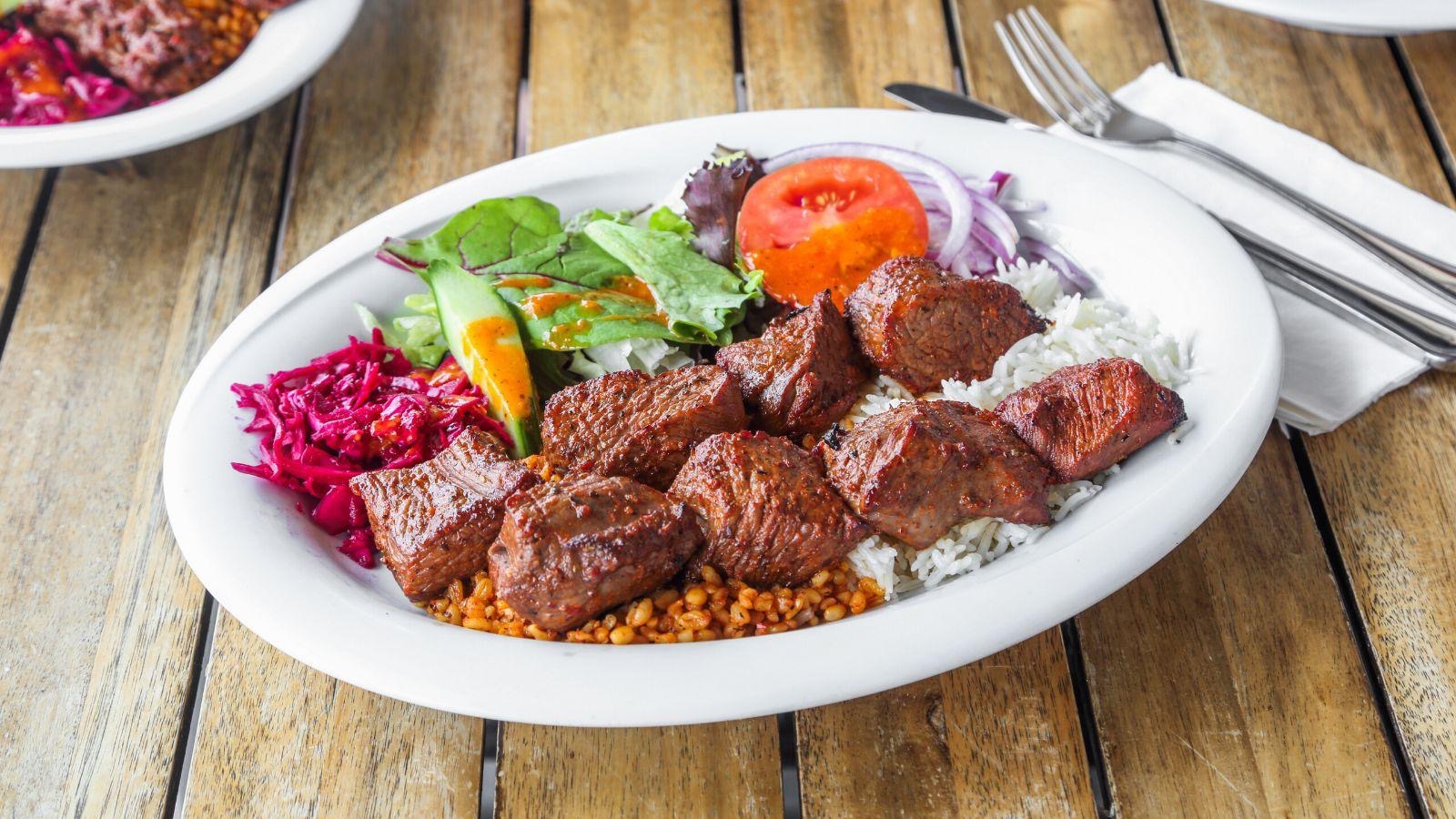 Grillowane na kamieniach lawowych szaszłyki z mięsa wołowego i baraniego marynowane w naszym specjalnym sosie, sałatka, grillowana papryka i pomidor.
