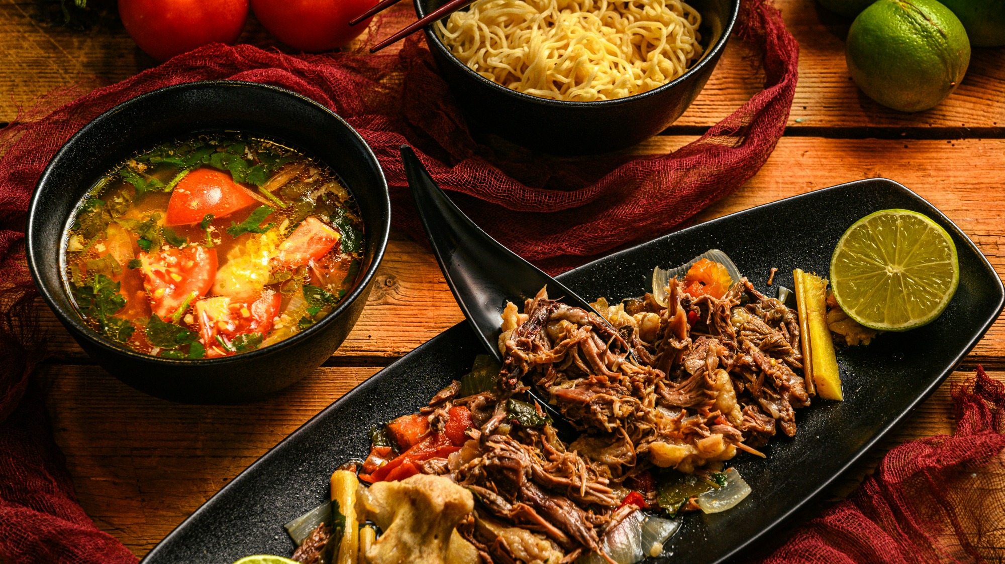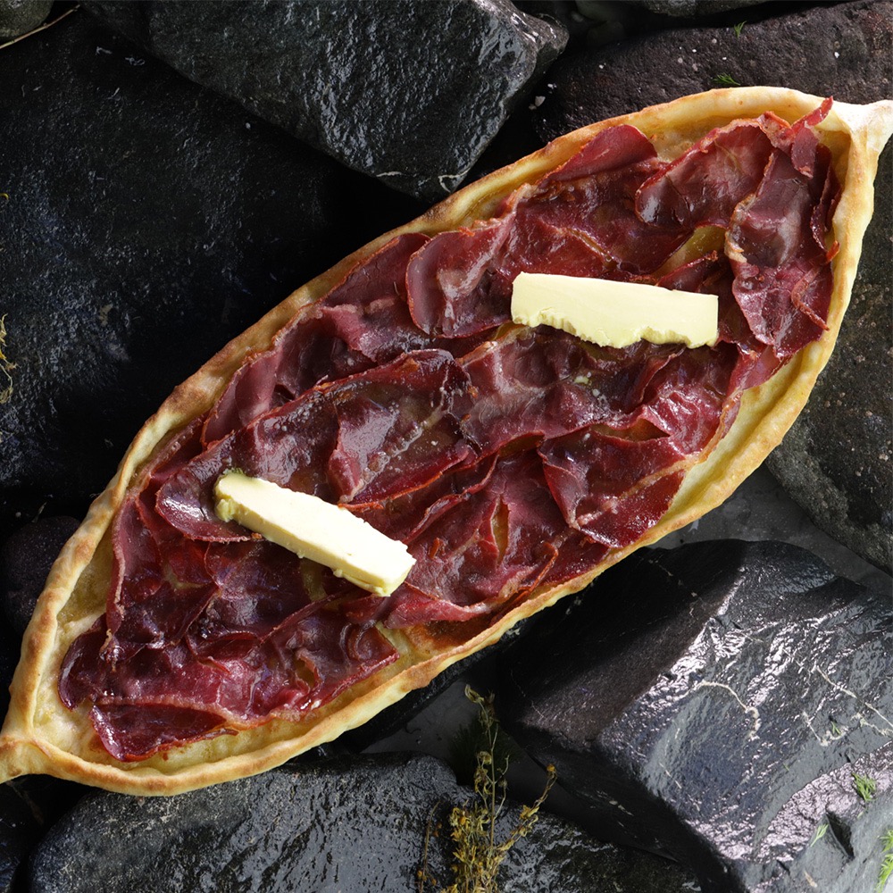 Grillowane na kamieniach lawowych szaszłyki z mięsa wołowego marynowane w naszym specjalnym sosie, sałatka, grillowana papryka i pomidor.