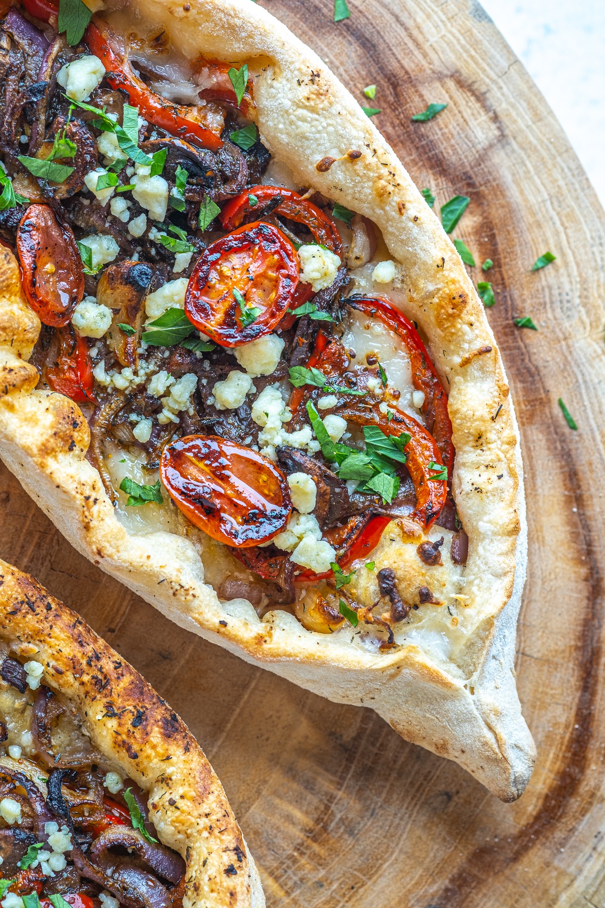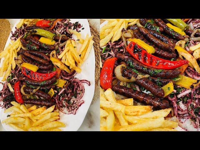 Arabskie kiełbaski grillowane na kamieniach lawowych, sałatka, grillowana papryka i pomidor.