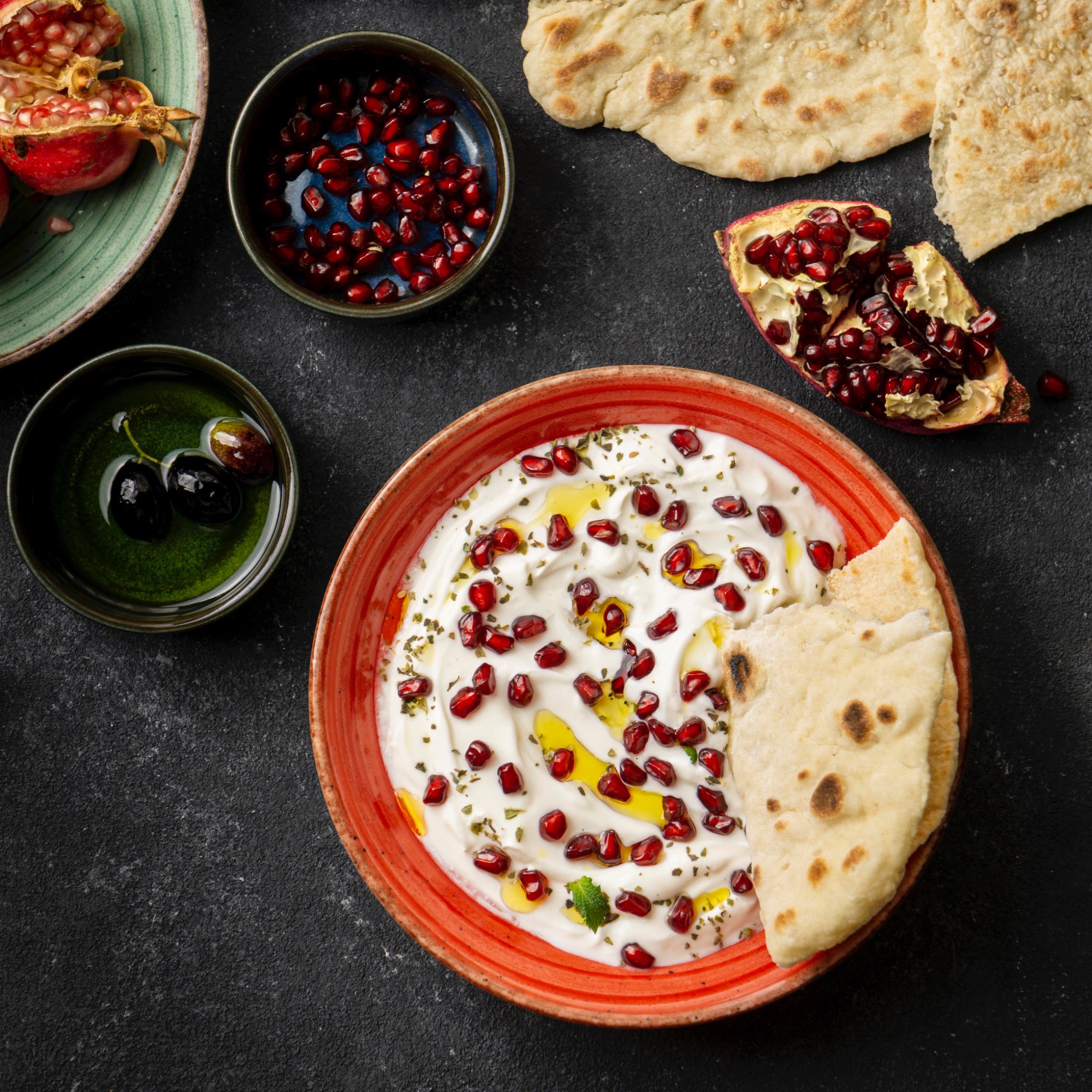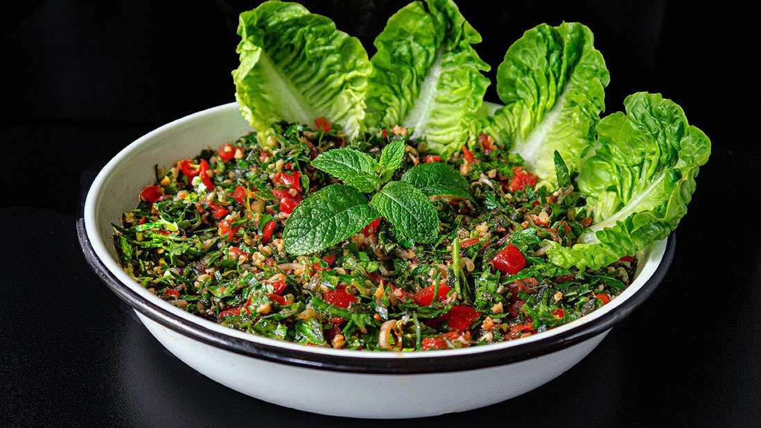 Sałatka orientalna z pietruszką, kaszą bulgur, pomidorami, cebulą, miętą, granatem, sokiem z cytryny i oliwą z oliwek.