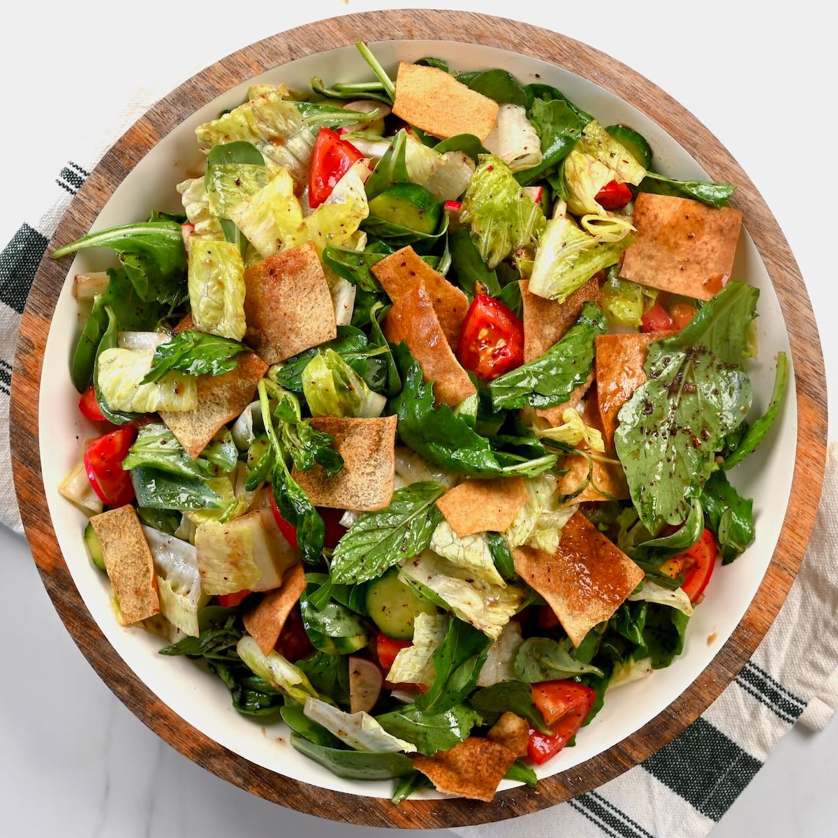 Świeża sałata, ogórki, pomidory, mięta i chrupiące prażone chipsy pita.