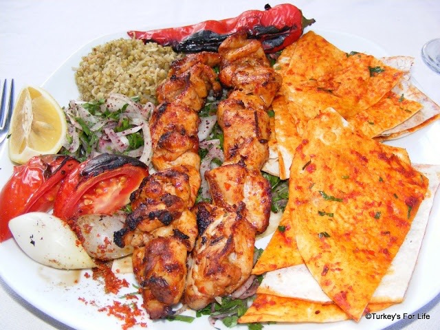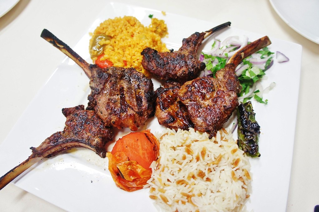 Grillowane na kamieniach lawowych szaszłyki z mięsa z baraniny marynowane w naszym specjalnym sosie, sałatka, grillowana papryka i pomidor.