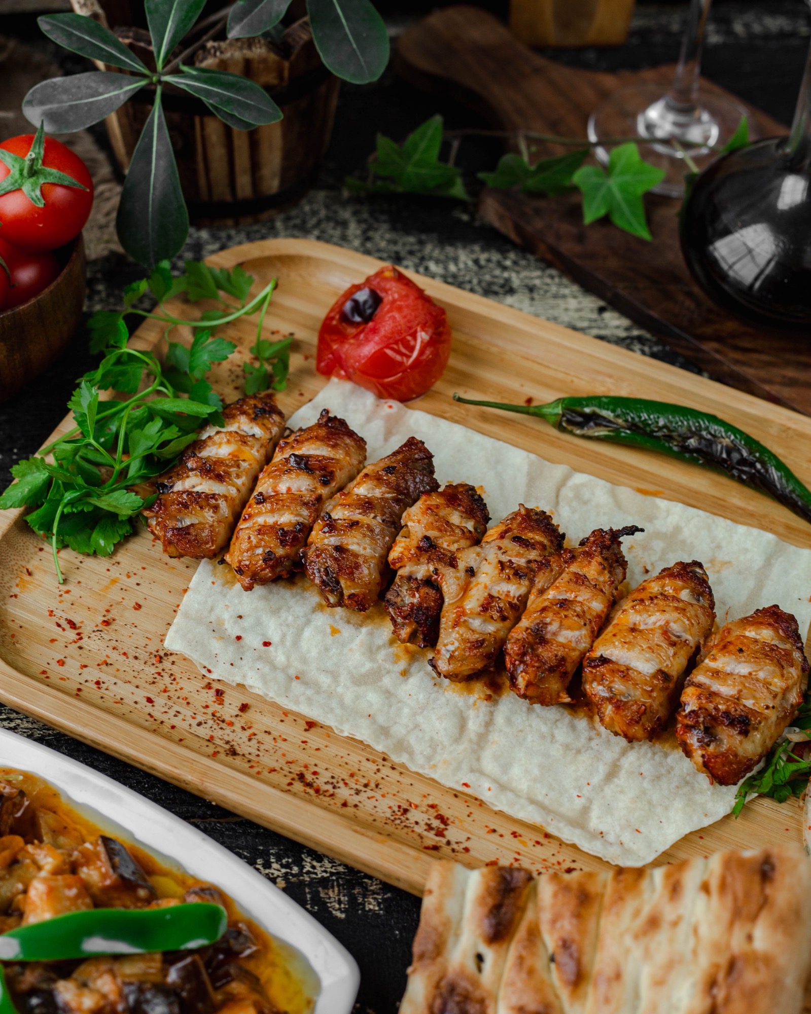 Mieszanka naszych dań z grilla: szaszłyk z kurczaka, wołowina BBQ, Adana kebab, skrzydełka z kurczaka, sałatka, grillowana papryka i pomidor.